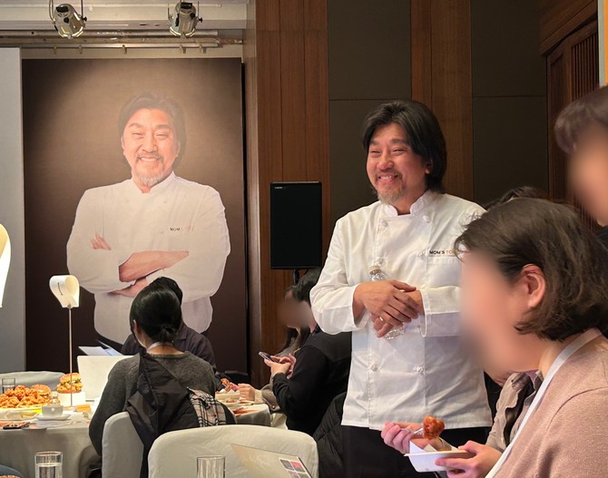 맘스터치는 21일 오전 서울 신라호텔 영빈관에서 에드워드 리와 함께 신메뉴 출시 기자간담회를 열었다. 이날 에드워드 리는 레시피 개발 과정을 들려주며 직접 기자들을 만나 신메뉴에 관해 설명했다.