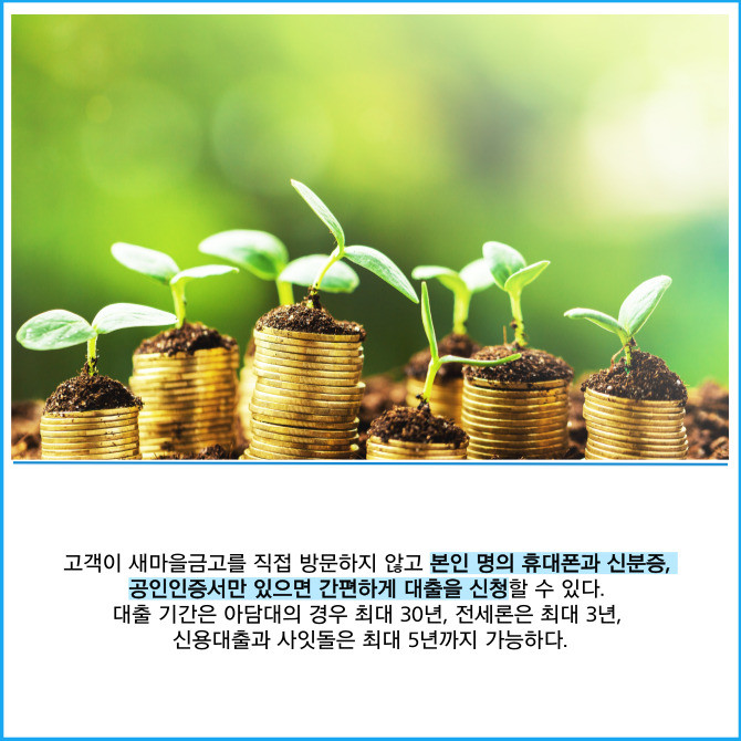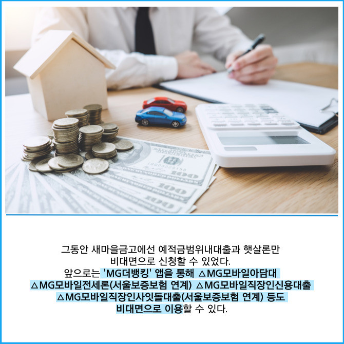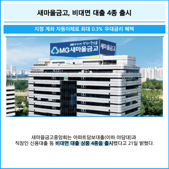 [프라임경제] 새마을금고중앙회는 아파트담보대출(이하 아담대)과 직장인 신용대출 등 비대면 대출 상품 4종을 출시했다고 21일 밝혔다.