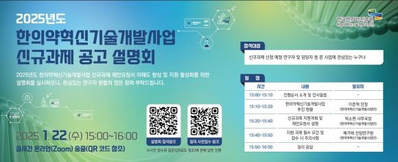 한국한의약진흥원 한의약혁신기술개발사업단은 지원 예정 연구자들의 이해를 돕기 위해 1월22일 오후 3시부터 온라인 설명회를 개최한다.