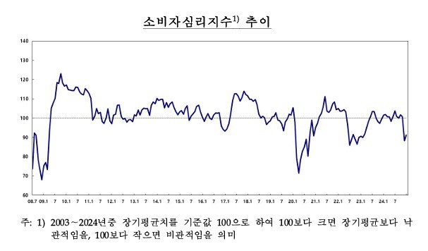 CCSI는 지난해 6월부터 11월까지 지속해서 100을 웃돌며 낙관세를 유지했다. 다만 계엄으로 인한 탄핵 정국 직후인 지난해 12월 CCSI 낙폭은 88.2로 급락했다. 이는 코로나19 팬데믹 시기였던 2020년 3월 이후 4년9개월 만에 가장 큰 수치다.