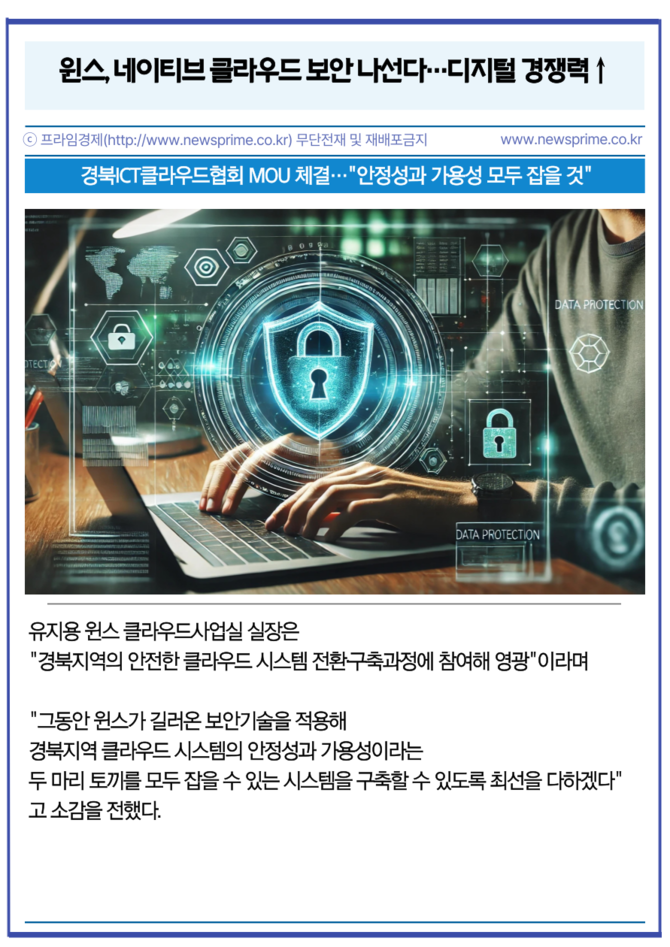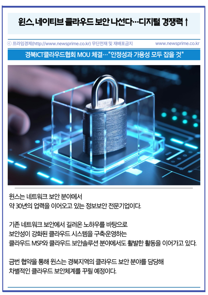 [프라임경제] 윈스(136540)가 경북지역의 안전한 클라우드 시스템 전환을 위한 기술 습득과 공공과 민간분야의 협업을 강화하기 위해 경북ICT클라우드협회와 MOU를 체결했다고 22일 밝혔다.