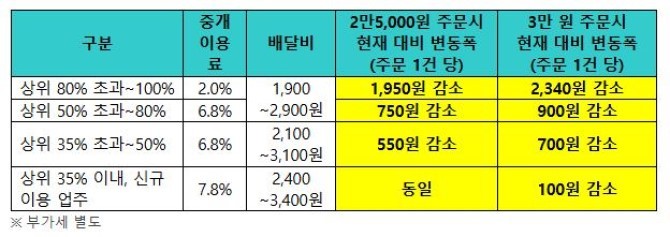 매출 △상위 35% 이내·신규 이용 업주는 중개이용료 7.8%, 배달비 2400~3400원을 △상위 35% 초과~50%는 중개이용료 6.8%, 배달비 2100~3100원을 △상위 50% 초과~80%는 중개이용료 6.8%, 배달비 1900~2900원을 △상위 80% 초과~100%는 중개이용료 2.0%, 배달비 1900~2900원을 차등 적용한다.
