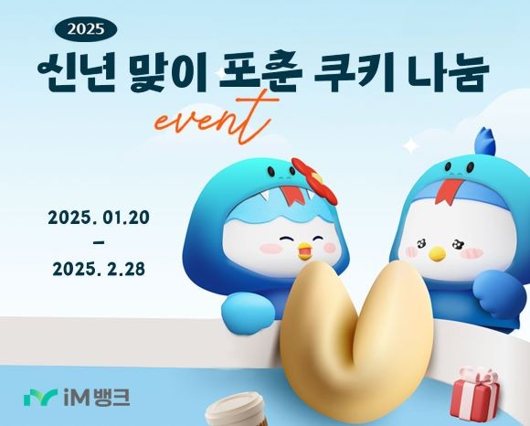 [프라임경제] iM뱅크(아이엠뱅크, 은행장 황병우)는 2025년 새해를 맞이해 앱 접속 고객을 대상으로 '새해 시즌 x 포춘쿠키 대고객 이벤트'를 실시해 신년운세 무료 제공 및 랜덤 현금 지급 등을 진행한다.