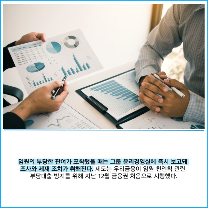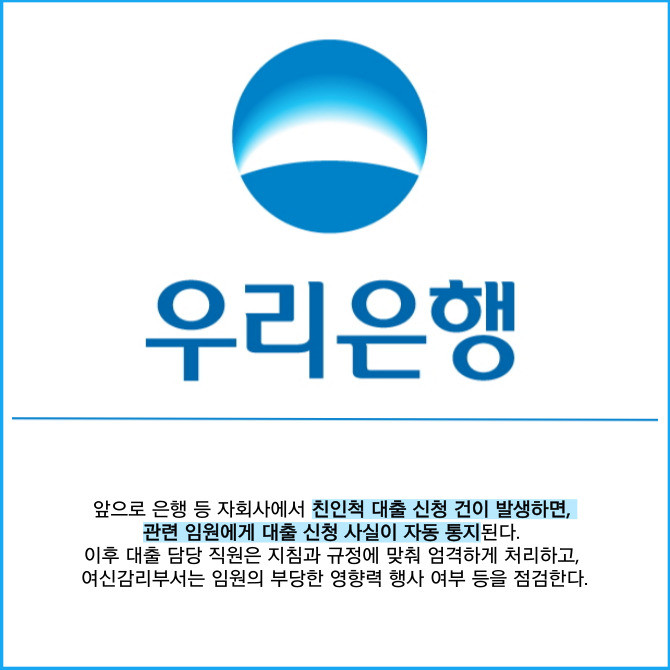 [프라임경제] 우리금융그룹(316140)이 그룹 임원 친인척 관련 부당대출 방지를 위해 임원 친인척 개인정보 등록제도를 본격적으로 시행한다고 23일 밝혔다.