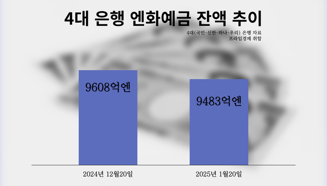 23일 금융권에 따르면 4대(국민·신한·하나·우리) 은행의 엔화예금 잔액은 지난 20일 기준 9483억엔이다. 지난해 12월20일 잔액인 9608억엔과 비교해 125억엔(한화 약 1147억원)이 감소했다.
