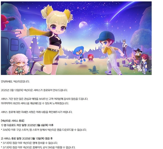 서비스 종료는 오는 3월13일 점검 후라고 밝혔다. 3월13일 점검 이후에는, 넥슨타운 홈페이지와 공식 SNS를 이용할 수 없다.