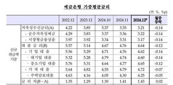 부문별로 보면 예·적금 등을 포함한 순수저축성예금의 금리는 3.22%, 양도성예금증서(CD)·금융채 등을 포함한 시장형금융상품 금리는 3.17%로 집계됐다. 전월 대비 금리 하락폭은 두 부문 모두 0.14%p로 동일했다.
