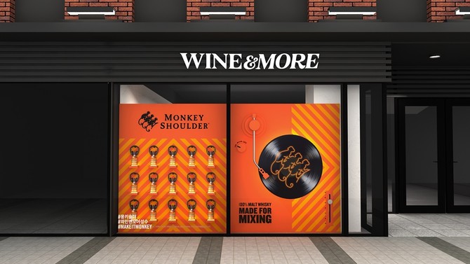 먼저, 와인앤모어의 외관 쇼윈도우에서는 브랜드의 정체성을 강조한 'SEE MONKEY' 캠페인 이미지를 만나볼 수 있다. 이미지는 몽키숄더를 대표하는 주황색을 활용해 시선을 사로잡으며, 몽키숄더의 재치 있고 활기찬 에너지를 표현하는 헤드셋, 턴테이블 등의 요소로 브랜드 이미지를 시각화했다. 매장 내부에는 몽키숄더 전용 존을 비롯해 글렌피딕, 발베니, 헨드릭스 진 등 윌리엄그랜트앤선즈코리아의 대표 브랜드도 함께 진열된다.
