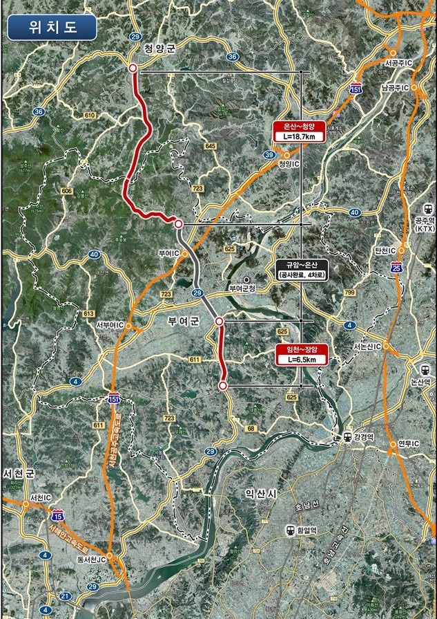 이번 도로건설사업은 국도29호선의 임천장암 구간(5.1km)을 4차로로 신설하는 사업과 은산면 홍산나령 구간(7.3km)을 4차로로 확장하는 사업으로, 총 사업비는 1815억원에 달한다.
