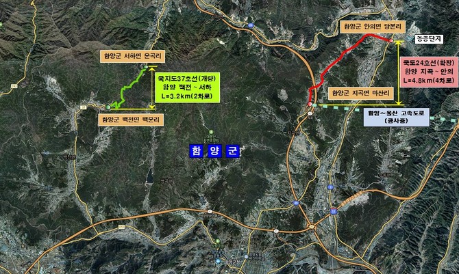 함양군이 이번에 선정된 사업은 국도 24호선 지곡면 지곡나들목에서 안의면 안의교차로를 연결하는 4.8km 구간(528억원)의 4차로 확장 사업과 주요 간선도로인 국지도 37호선 백전면에서 서하면 구간(3.2km, 787억원)의 2차로 개량 사업이다.