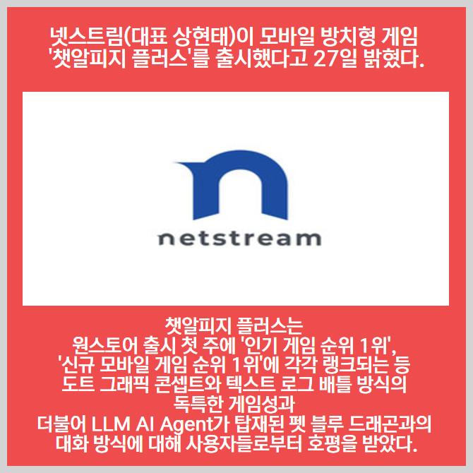 [프라임경제] 넷스트림(대표 상현태)이 모바일 방치형 게임 '챗알피지 플러스'를 출시했다고 27일 밝혔다.