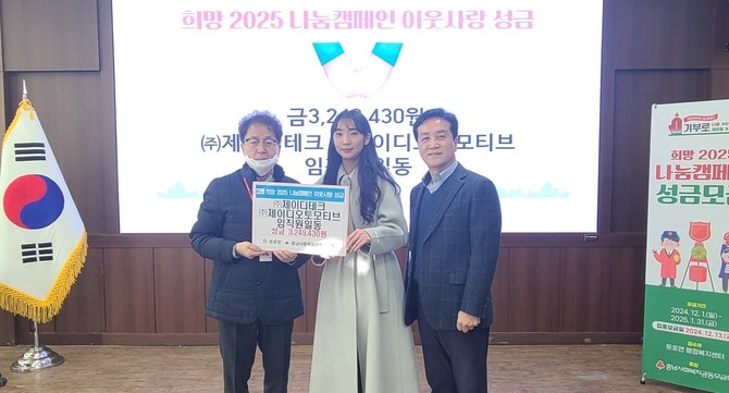 [프라임경제] ㈜제이디테크·㈜제이디오토모티브(대표이사 박윤수)는 지난 24일 둔포면(면장 오배환)을 방문해 '희망2025나눔캠페인' 이웃돕기 성금 324만9430원을 전달했다.