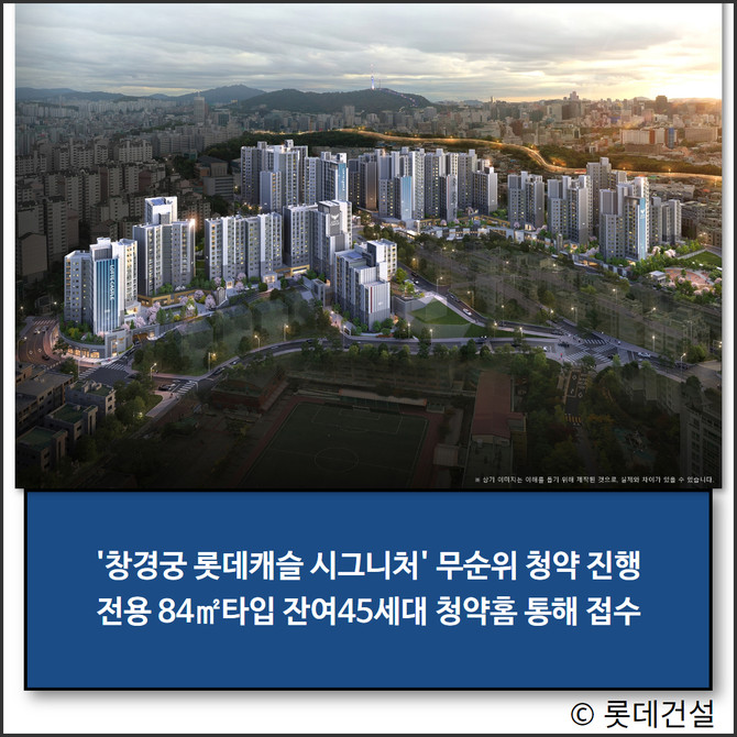 롯데건설에 따르면 지난해 말 진행된 '창경궁 롯데캐슬 시그니처' 1순위 청약 결과 최고 32.2:1의 높은 경쟁률로 전 타입 마감했다. 전용 59㎡A·B·C 타입은 완판을 기록했다.
