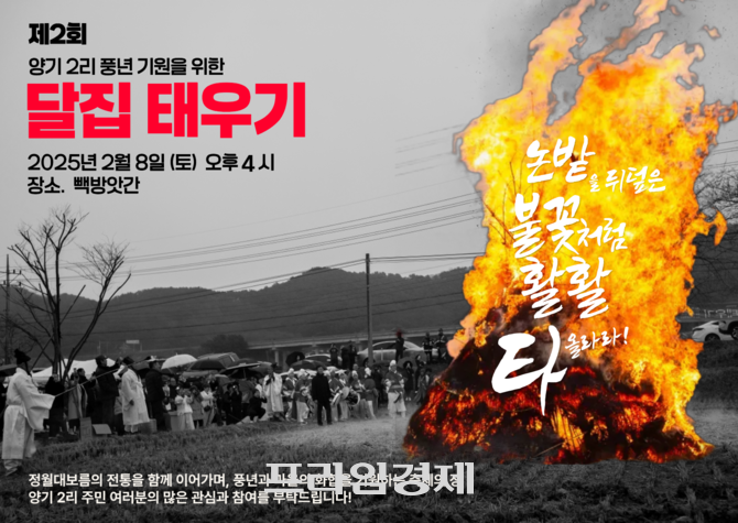 [프라임경제] 충남 보령시 양기2리 주민들이 한 해의 풍년과 마을의 화합을 기원하는 제2회 양기2리 달집태우기 행사를 오는 2025년 2월8일 오후 4시 남포면 월전로 684 빽방앗간에서 개최한다.