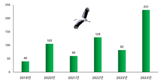 [프라임경제] 충남 예산군이 6년간 진행한 전국황새동시모니터링 결과, 국내에서 최대 230여 마리의 야생 황새가 서식하는 것으로 확인됐다. 이는 2019년 40마리에서 5배 이상 증가한 수치다.