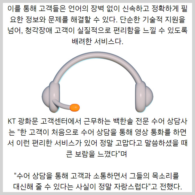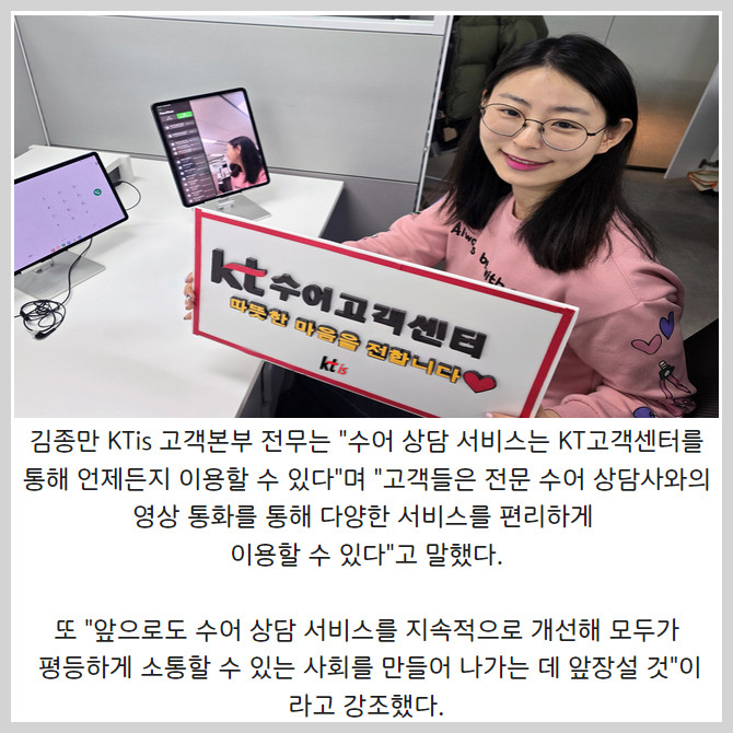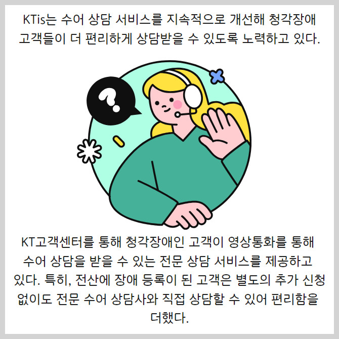 [프라임경제] KTis(대표 이선주)가 '한국 수어의 날'을 맞아 KT고객센터에서 제공하는 수어 상담 서비스의 중요성과 가치를 강조했다.