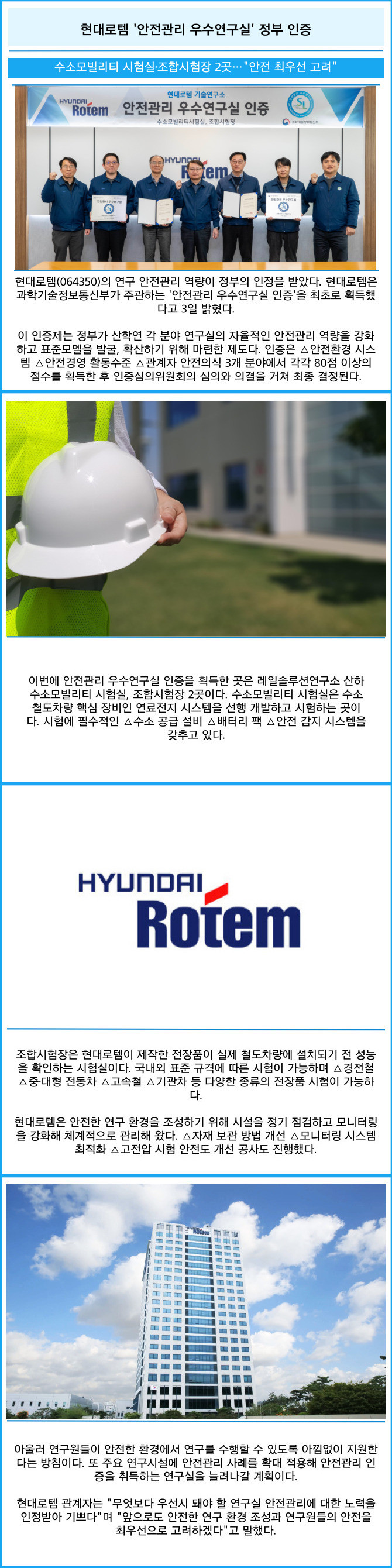 [프라임경제] 현대로템(064350)의 연구 안전관리 역량이 정부의 인정을 받았다. 현대로템은 과학기술정보통신부가 주관하는 '안전관리 우수연구실 인증'을 최초로 획득했다고 3일 밝혔다.