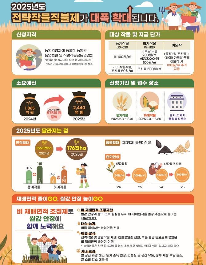 한편 올해부터 하계작물로 깨(참깨, 들깨)가 추가됐으며, 밀(동계)의 직불금 ha당 단가는 지난해 50만원에서 100만원으로, 조사료(하계)는 430만원에서 500만원으로 각각 상향됐다.