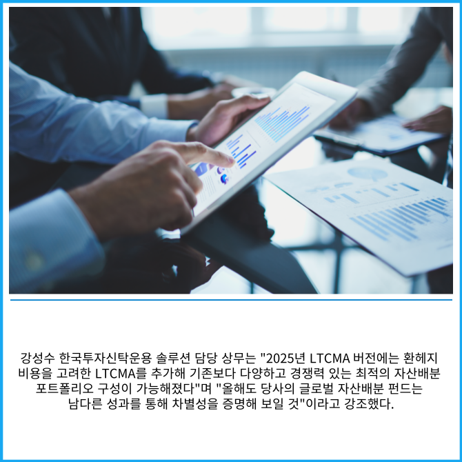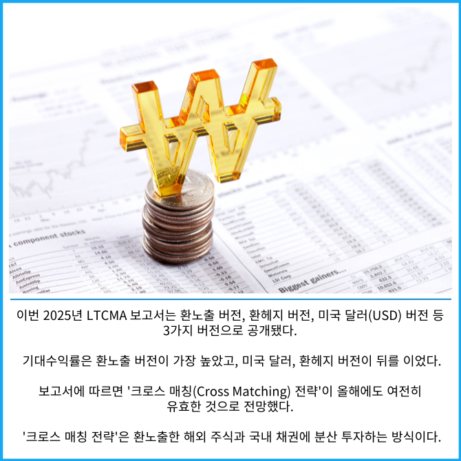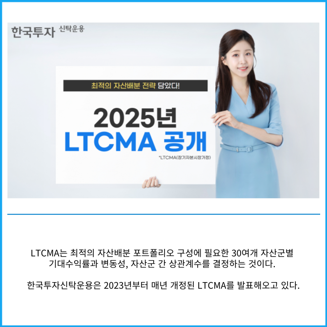 LTCMA는 최적의 자산배분 포트폴리오 구성에 필요한 30여개 자산군별 기대수익률과 변동성, 자산군 간 상관계수를 결정하는 것이다. 한국투자신탁운용은 2023년부터 매년 개정된 LTCMA를 발표해오고 있다.