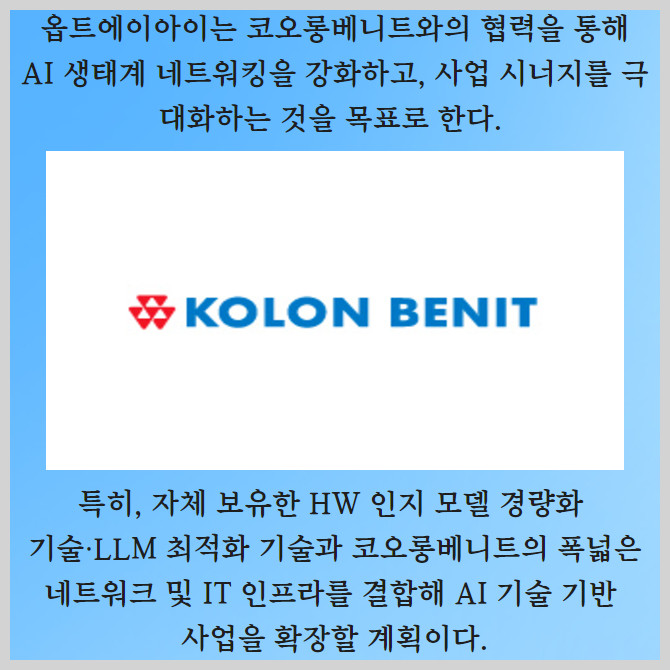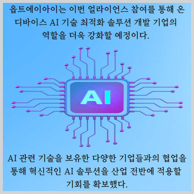 [프라임경제] 온디바이스 AI 최적화 솔루션 기업 옵트에이아이(대표 이재호)가 국내 AI 분야 70여 개의 리딩 기업이 참여하는 대규모 인공지능(AI) 얼라이언스에 새롭게 합류한다. 옵트에이아이는 코오롱그룹의 '코오롱베니트'가 지난해 발족한 'AI 얼라이언스'에 합류하는 전략적 업무협약(MOU)을 체결했다고 4일 밝혔다.