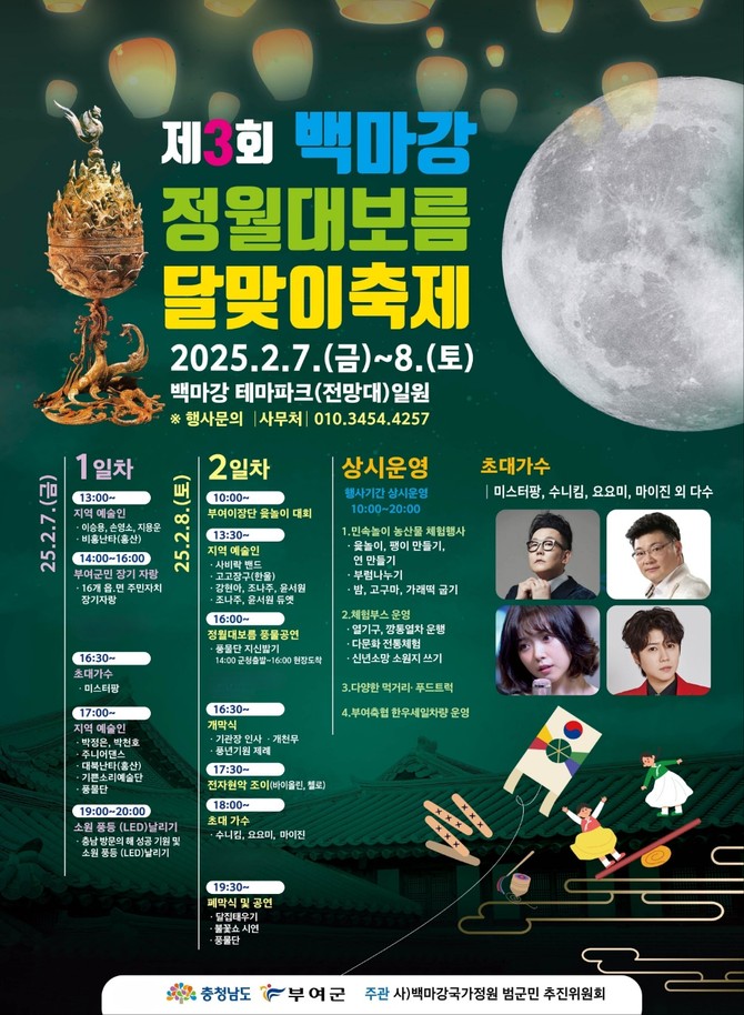 [프라임경제] 충남 부여군(군수 박정현)은 2025년 정월대보름을 맞아 (사)백마강 국가정원 범군민 추진위원회 주관으로 '제3회 백마강 정월대보름 달맞이 축제'를 개최한다고 밝혔다.
