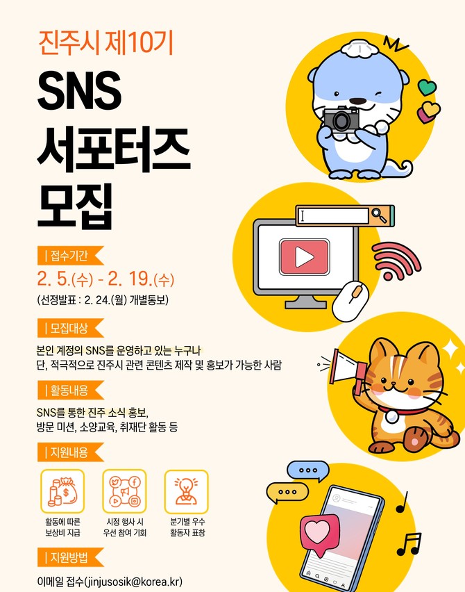 [프라임경제] 진주시가 공식 SNS 콘텐츠 제작과 홍보에 참여할 '제10기 진주시 SNS 서포터즈'를 2월5일부터 19일까지 15일간 모집한다.