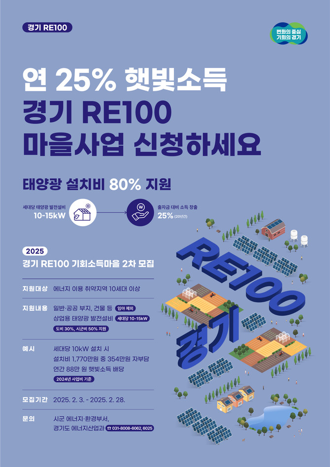 경기 RE100 '기회소득 마을' 사업 참여 신청기간은 2월 28일까지며, '경기RE100 누리집 경기RE100이야기 게시판'에서 '기회소득 마을'을 검색해 사업계획서와 구비서류를 작성한 후 관할 시군 에너지 담당 부서에 접수하면 된다.
