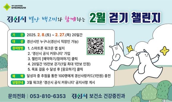 경산시는 이번 챌린지를 통해 시민들의 걷기 참여를 독려할 계획이다. 참가자들은 2월 한 달 동안 15만보 걷기를 목표로 하며, 목표를 달성한 사람들 중 추첨을 통해 100명에게 경산사랑카드 1만원권을 지급할 예정이다.