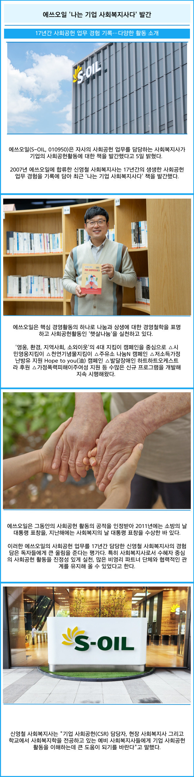 [프라임경제] 에쓰오일(S-OIL, 010950)은 자사의 사회공헌 업무를 담당하는 사회복지사가 기업의 사회공헌활동에 대한 책을 발간했다고 5일 밝혔다.