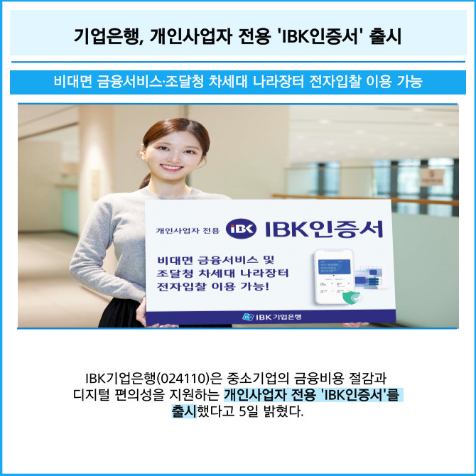 [프라임경제] IBK기업은행(024110)은 중소기업의 금융비용 절감과 디지털 편의성을 지원하는 개인사업자 전용 'IBK인증서'를 출시했다고 5일 밝혔다.