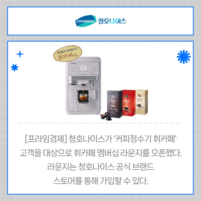 [프라임경제] 청호나이스가 '커피정수기 휘카페' 고객을 대상으로 휘카페 멤버십 라운지를 오픈했다고 5일 밝혔다. 라운지는 청호나이스 공식 브랜드 스토어를 통해 가입할 수 있다.