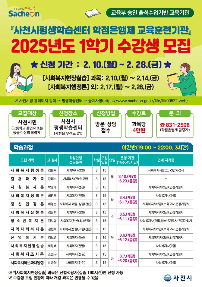 [프라임경제] 사천시평생학습센터 학점은행제 교육훈련기관은 2월10일부터 28일까지 2025년도 1학기 평가인정 학습과정 수강생을 모집한다.