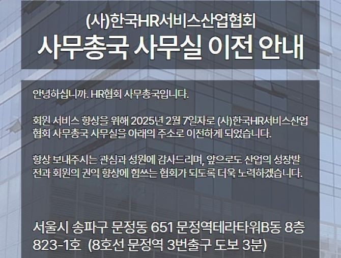 [프라임경제] 한국HR서비스산업협회(회장 김정현, 이하 협회)는 회원사 서비스의 질적 향상‧원활한 정책 업무 수행을 위해 사무실을 이전한다.