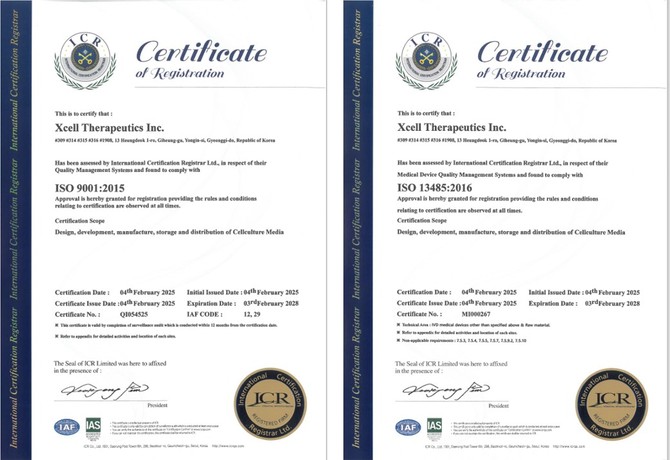 엑셀세라퓨틱스는 세포배양배지 '셀커(CellCor)'의 개발·제조 및 품질경영에 대한 해당 인증을 획득함으로써 엄격한 글로벌 수준을 충족하는 품질경영시스템을 인정받았다.