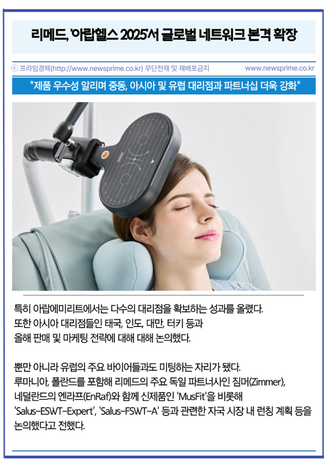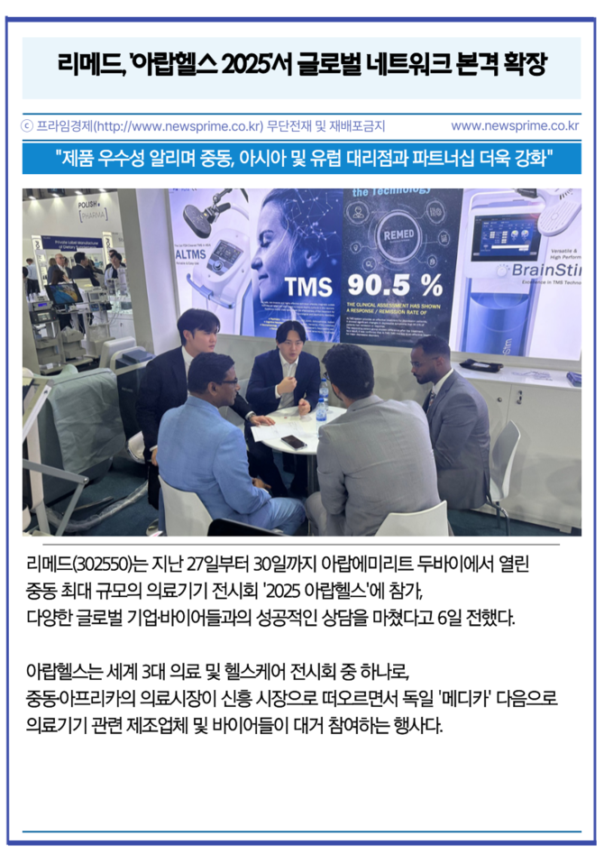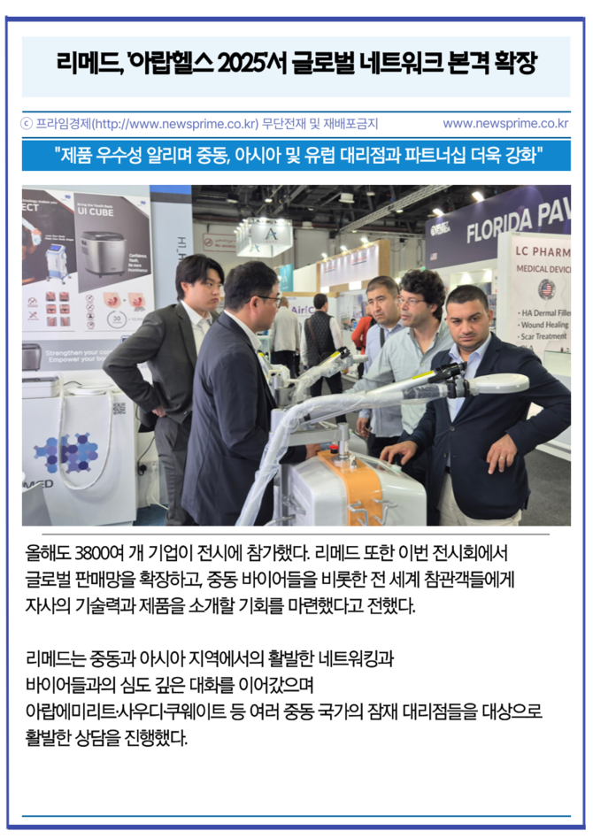 [프라임경제] 리메드(302550)는 지난 27일부터 30일까지 아랍에미리트 두바이에서 열린 중동 최대 규모의 의료기기 전시회 '2025 아랍헬스'에 참가, 다양한 글로벌 기업·바이어들과의 성공적인 상담을 마쳤다고 6일 전했다.