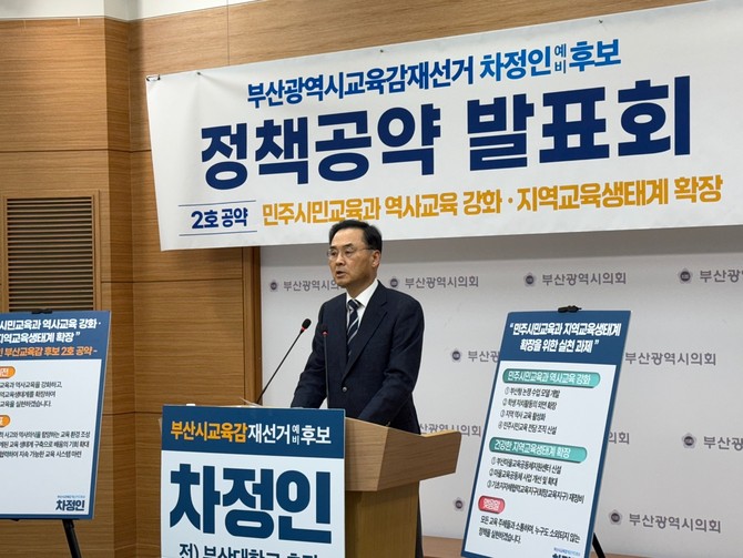 [프라임경제] 차정인 부산시교육감 재선거 예비후보는 5일 오전 부산시의회 브리핑룸에서 기자회견을 열고 민주시민교육과 역사교육 강화 및 지역교육 생태계 확장 공약을 발표했다. 이는 지난 23일 1호 공약인 '교실 수업 회복 및 교사의 수업 주권'에 이은 두 번째 기자회견이다.