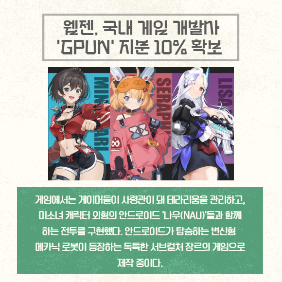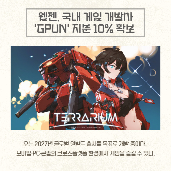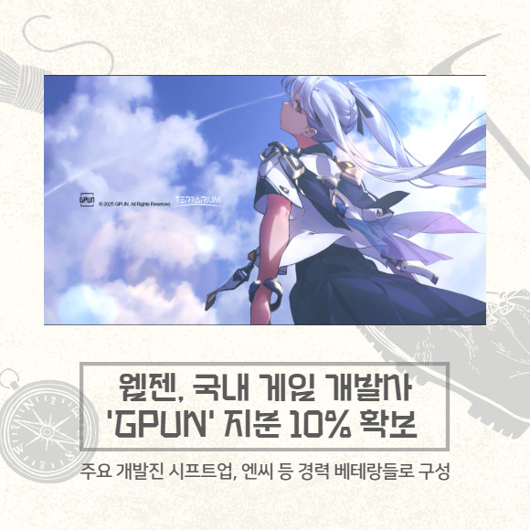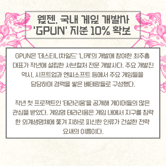 [프라임경제] 웹젠(069080)이 국내 게임 개발사 'GPUN(이하 지피유엔)'의 초기 투자자로 참여하며 지분 10%를 확보했다고 6일 밝혔다.