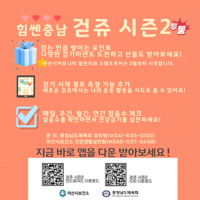 [프라임경제] 충남 아산시보건소는 시민들의 건강한 걷기 실천을 위해 '걷쥬 시즌2' 앱을 활용한 걷기 챌린지를 2월부터 운영한다고 밝혔다.