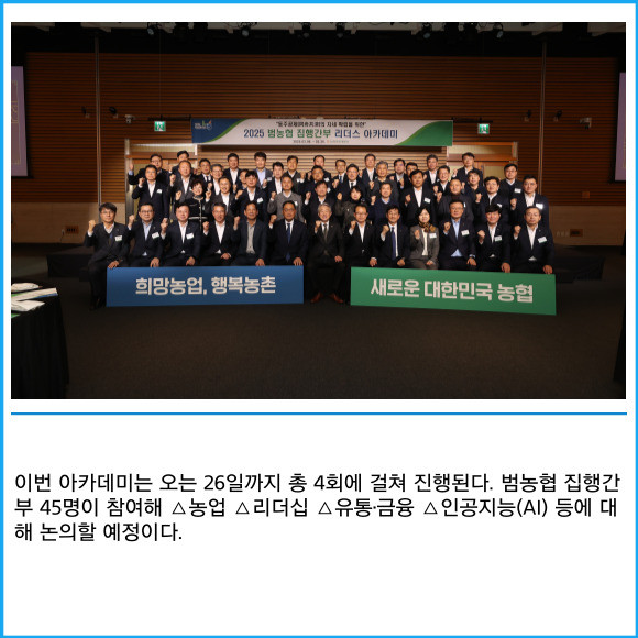 [프라임경제] 농협중앙회가 새로운 대한민국 농협 비전 달성을 위해 '2025년 범농협 집행간부 아카데미'를 개최했다고 6일 밝혔다.