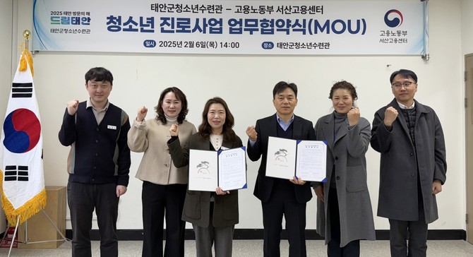 태안군에 따르면, 태안군청소년수련관은 지난 6일 청소년수련관 소통마당에서 박지연 운영대표(군 가족정책과장)와 이강은 서산고용센터 소장 등이 참석한 가운데 업무협약식을 개최했다. 이날 협약을 통해 양 기관은 청소년 진로 지원 사업과 연계한 프로그램을 공동 개발하기로 합의했다.