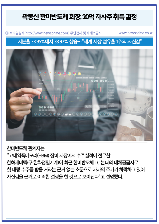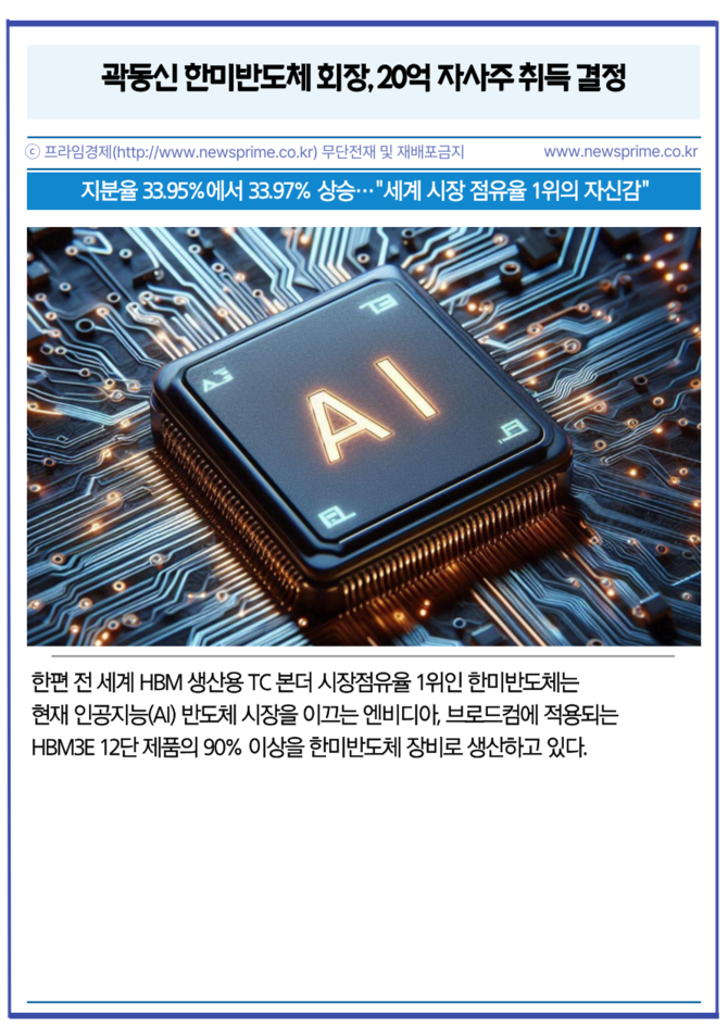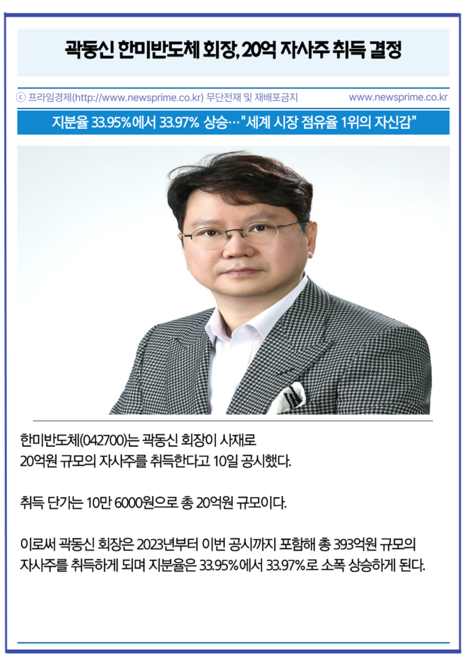 [카드] 곽동신 한미반도체 회장, 20억 자사주 취득 결정