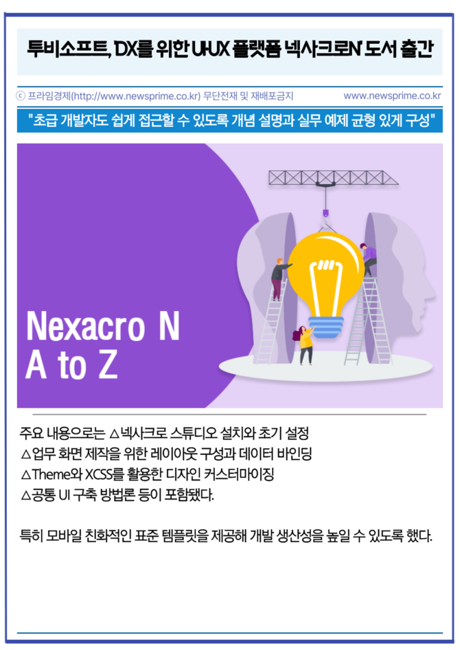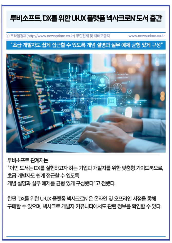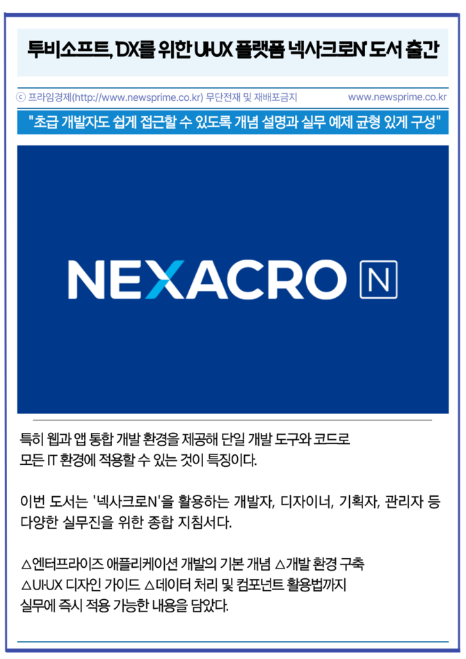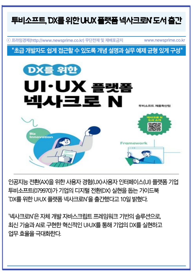 [프라임경제] 인공지능 전환(AX)을 위한 사용자 경험(UX)·사용자 인터페이스(UI) 플랫폼 기업 투비소프트(079970)가 기업의 디지털 전환(DX) 실현을 돕는 가이드북 'DX를 위한 UI·UX 플랫폼 넥사크로N'을 출간했다고 10일 밝혔다.