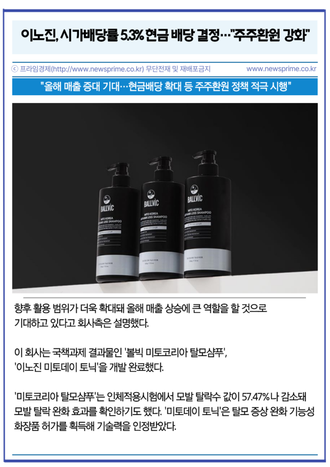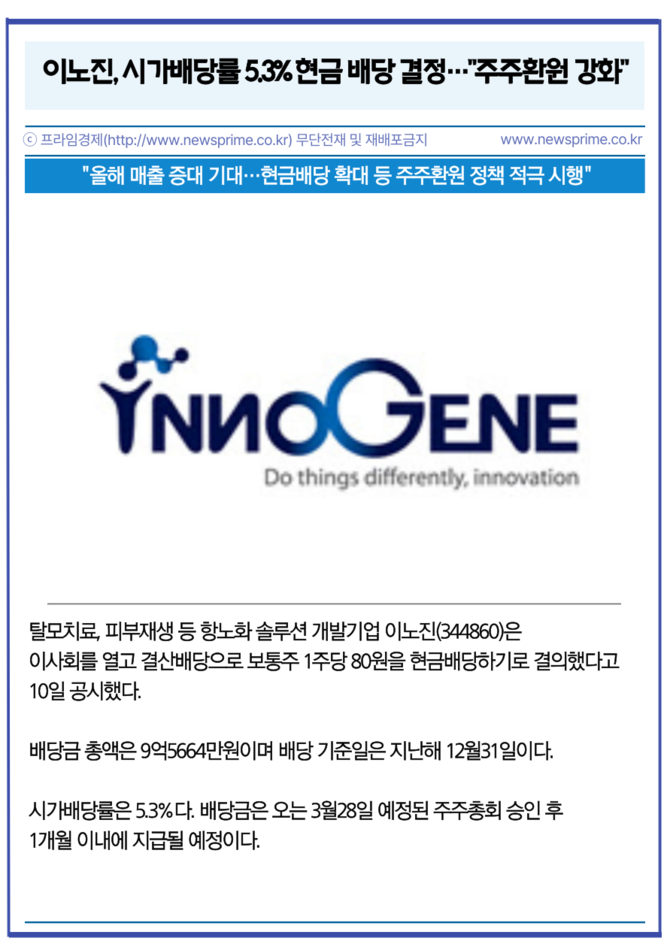 [프라임경제] 탈모치료, 피부재생 등 항노화 솔루션 개발기업 이노진(344860)은 이사회를 열고 결산배당으로 보통주 1주당 80원을 현금배당하기로 결의했다고 10일 공시했다.