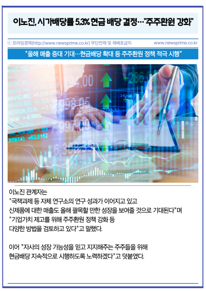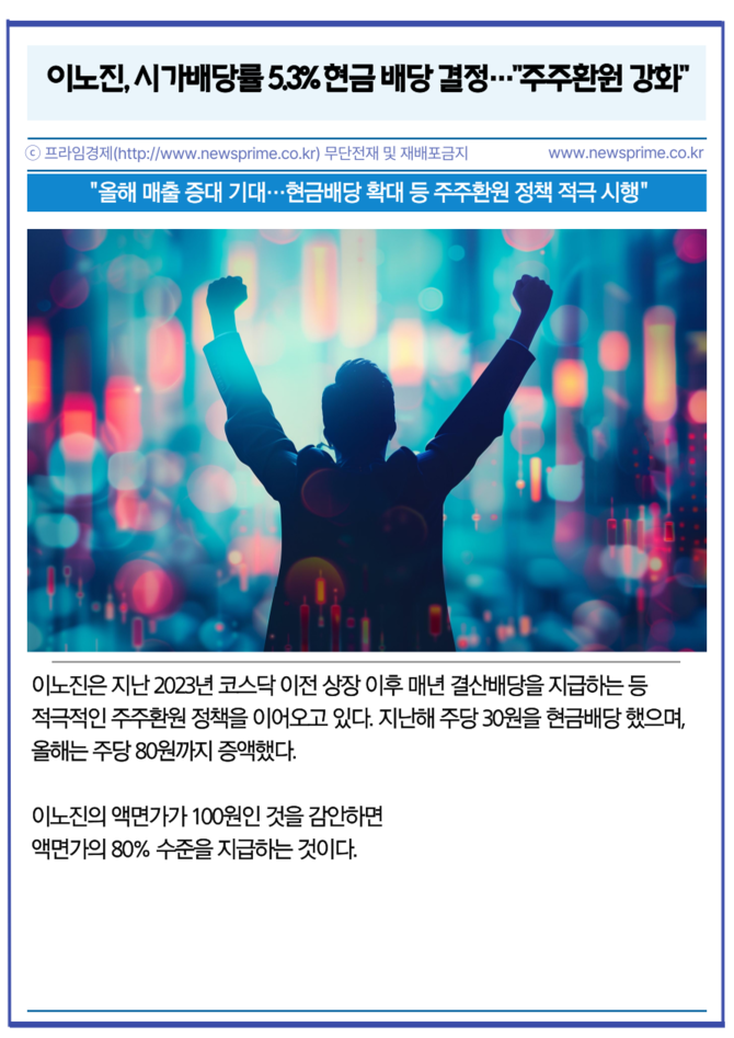 이노진은 지난 2023년 코스닥 이전 상장 이후 매년 결산배당을 지급하는 등 적극적인 주주환원 정책을 이어오고 있다. 지난해 주당 30원을 현금배당 했으며, 올해는 주당 80원까지 증액했다. 이노진의 액면가가 100원인 것을 감안하면 액면가의 80% 수준을 지급하는 것이다.