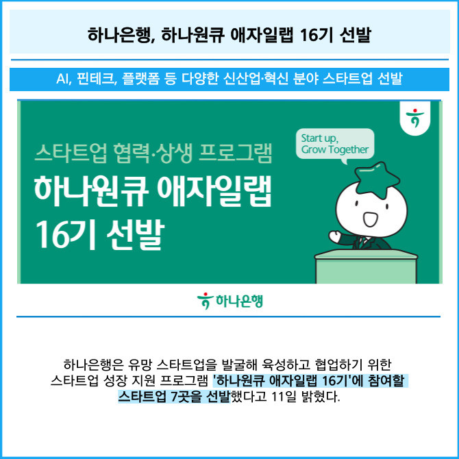 [프라임경제] 하나은행은 유망 스타트업을 발굴해 육성하고 협업하기 위한 스타트업 성장 지원 프로그램 '하나원큐 애자일랩 16기'에 참여할 스타트업 7곳을 선발했다고 11일 밝혔다.