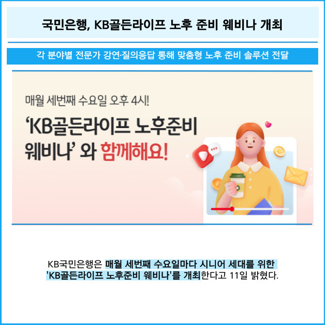 [프라임경제] KB국민은행은 매월 세번째 수요일마다 시니어 세대를 위한 'KB골든라이프 노후준비 웨비나'를 개최한다고 11일 밝혔다.