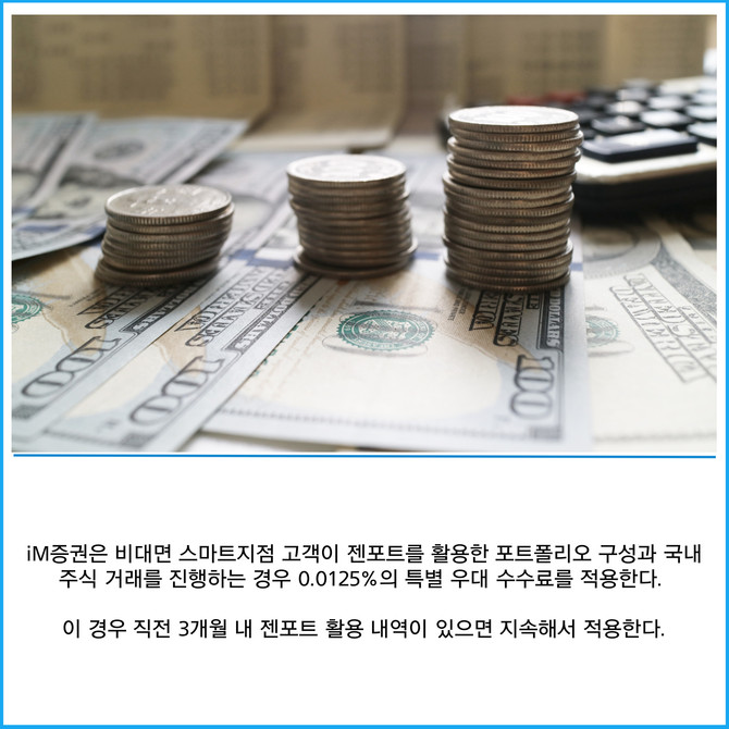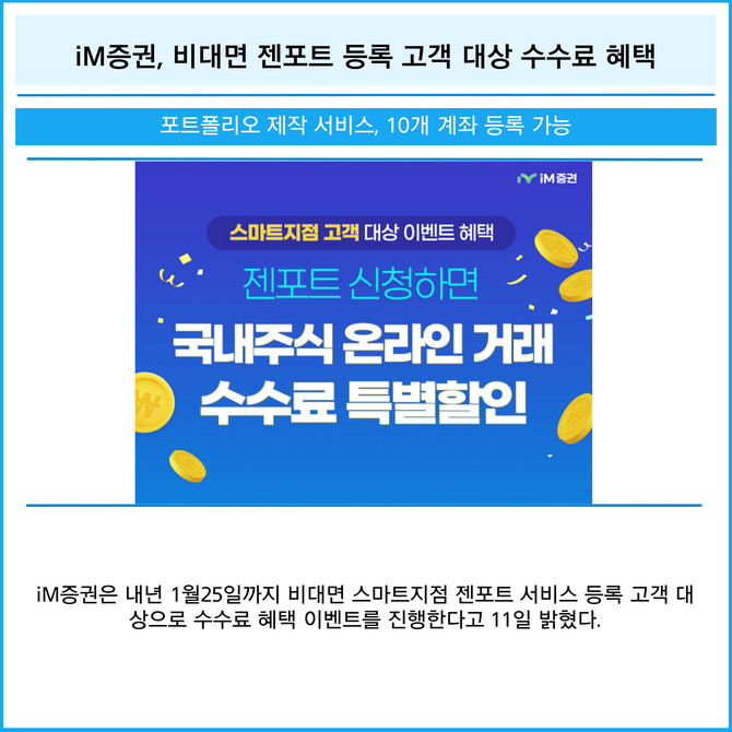 [프라임경제] iM증권은 내년 1월25일까지 비대면 스마트지점 젠포트 서비스 등록 고객 대상으로 수수료 혜택 이벤트를 진행한다고 11일 밝혔다.