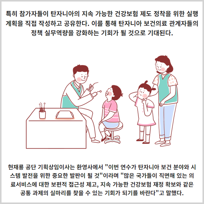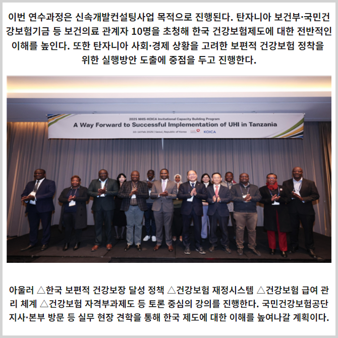 [프라임경제] 국민건강보험공단(이사장 정기석, 이하 공단)은 2월 10일부터 6일간 탄자니아 보건부·국민건강보험 기금 등 소속 보건의료 관계자들을 대상으로 역량강화 단기 연수 과정을 실시한다고 11일 밝혔다.