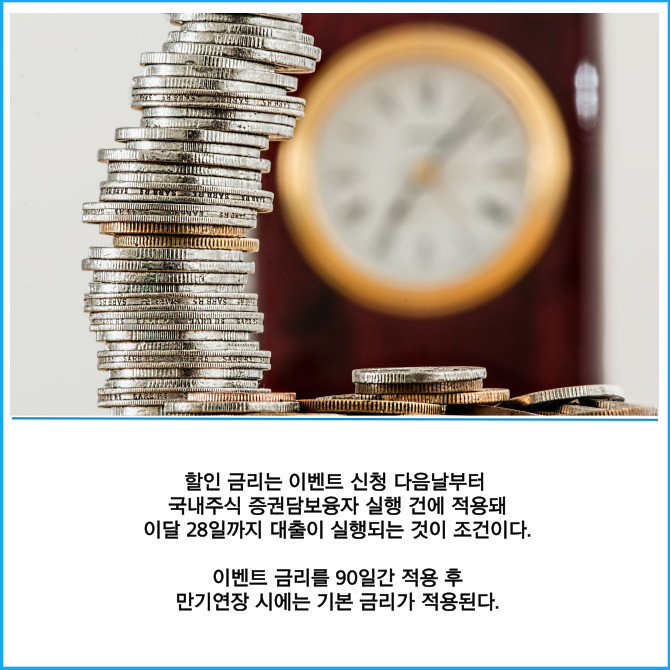 국내주식 증권담보융자 이벤트는 신청 고객에 한해 다음날부터 90일간 '연 4.4%' 할인 금리를 제공한다.
