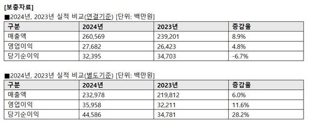 이는 전년 대비 연결 매출액은 9% 증가하고 영업이익은 5% 증가한 수치다. 당기순이익은 7% 감소했다. 별도 기준으로는 전년대비 매출액 6%(132억), 영업이익 12%(37억), 당기순이익은 28%(98억) 각각 증가했다.